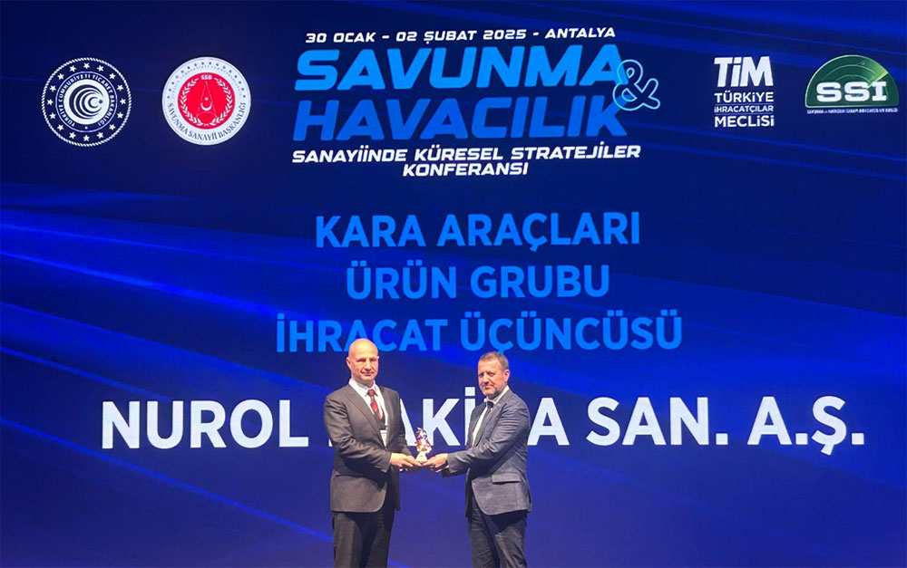 Nurol Makina, savunma ve havacılık sanayiinin önemli organizasyonlarından biri olan Küresel Stratejiler Konferansı kapsamında düzenlenen ödül töreninde, kara araçları sektöründe “İhracat Üçüncülüğü Ödülü”ne layık görüldü. Nurol Makina adına, ödülü Genel Müdür Yardımcısı Dr. Anıl KAREL, Savunma Sanayii Başkan Yardımcısı Gökhan Uçar'dan aldı.