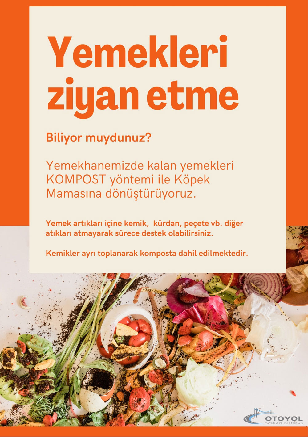Otoyol A.Ş., projede yer alan işletmelerde oluşan yemek atıklarını sürdürülebilir bir yöntemle değerlendiriyor. Bu atıklar kompost işlemiyle kedi ve köpek mamasına dönüştürülüyor. Uygulama, çevresel etkilerin azalmasına ve kaynakların verimli biçimde yeniden kullanılmasına katkı sağlıyor.