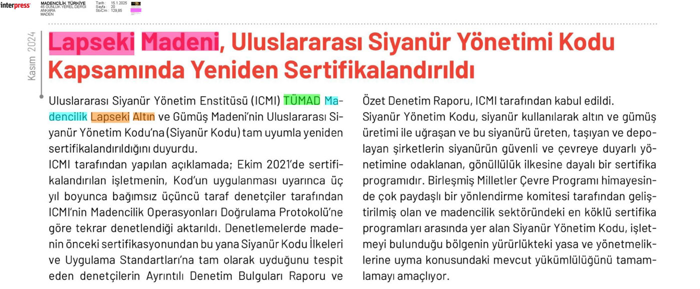 Lapseki Madeni, Uluslararası Siyanür Yönetim Kodu Kapsamında Yeniden Sertifikalandırıldı